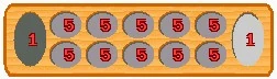 The board has five regular holes per row and, in addition, a bigger storehole at each end. The small holes are called kolosso and the big ones kolomei. Each player owns the store to his right.