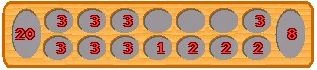 - In rare circumstances all holes may have three seeds. If the player still has one or several seeds in hand, he puts these in the hole to his far right (called atappe ("heap")) without capturing them. The opponent then takes the three seeds from his heap and drops one of them in his opponent's heap, another one in that hole from which he removed the seeds and the last one in the next adjacent hole on his side, giving it four seeds, which he then captures, thus ending the move.