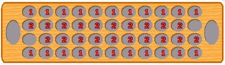 Chuba is played on a board of four parallel rows made of eleven holes called "pockets". Each player confines his playing to the two rows nearest to him. At each end the board is provided with a receptacle for containing the captured counters in the playing of the game. Initially there is one counter in each pocket of the outer rows, while there are two counters in the pockets of the inner rows except the pocket on the extreme left (as seen from the respective player) which is kept vacant.