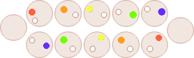 The Glass Bead Game is played on a board of two rows, each consisting of five round pits, and a large cup at either end which serves as a store for captured pieces. A player owns the five pits on his side of the board and the store to his right. Initially there are two beads in each hole: one stone and one "gem". The gems are worth according to their color: yellow = 1 point, green = 2 points, blue = 3 points, red = 4 points, purple = 5 points. The stones are neutral.