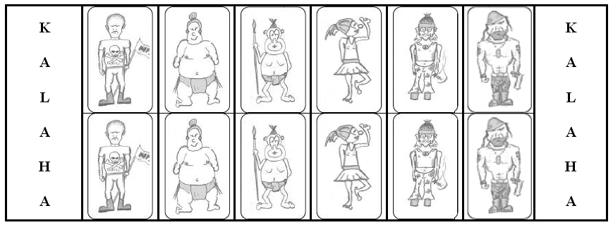 - Initially each cell has six cards (known as "characters"), which either depict a soldier, cannibal, ballet dancer, hippie, sumo fighter or hooligan. No start position was given in the written rules, but the game demo (a Java applet) always begins with the set-up shown on the right (6 cards of the same type in each cell). The cells are called "ambo", the stores are named "kalaha" and the seeds are known as "characters".