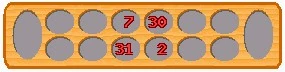 At their first turn each player picks up the shells of the rightmost filled hole in their row and distributes them into the succeeding holes, one by one, in clockwise direction. If the last shell falls into an occupied hole, its contents are distributed in another lap until the last shell is dropped into an empty hole. In the opening phase nothing can be captured.