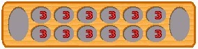 The game is played on a board (or facsimile thereof), which is composed of two rows of six small spaces each and a large space at each each called "mancala", which serves as a store. A player controls the row on his side of the board.