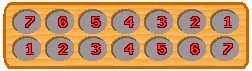 Seethaipandi is played on a board made of two rows of seven pits. At the beginning there is one seed in the first pit of each row (from the left), two on the second, three on the third, and so on.