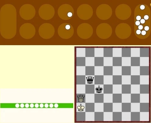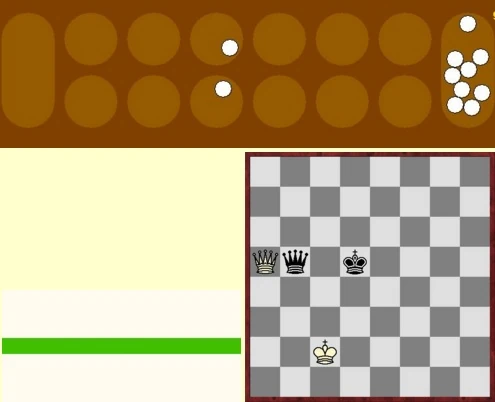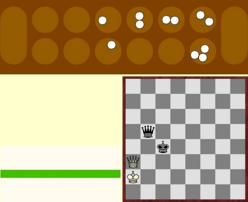 The only difference between standard Awarichess and synchronous Awarichess is that in the latter game powers are not accumulated. On the contrary, each seed that is taken in the game of Awele is converted at once into chess moves . So the phases of playing Awele and Chess quickly succeed one another.